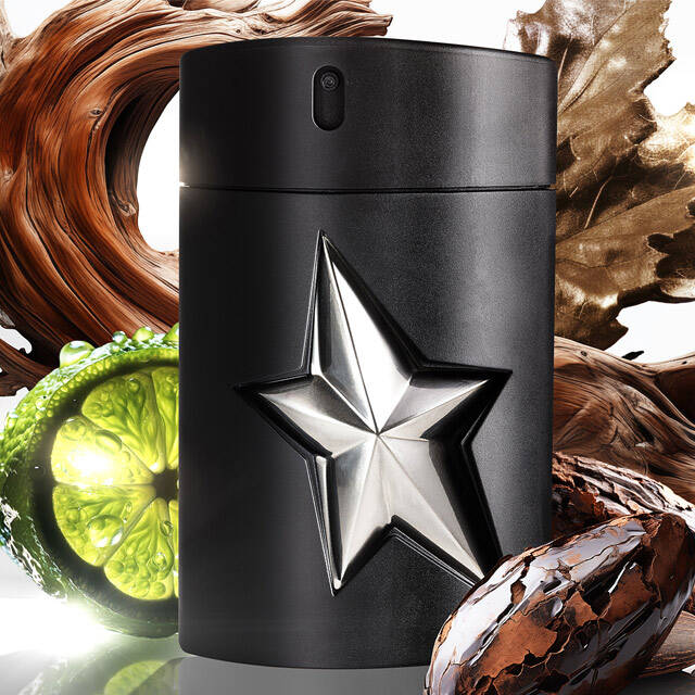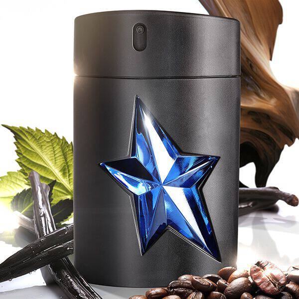 A*Men Eau de Toilette is defined by its dimensions of patchouli, Bourbon vanilla, and coffee. The striking A*Men bottle features a luminous blue star set into a rugged black rubber flask.