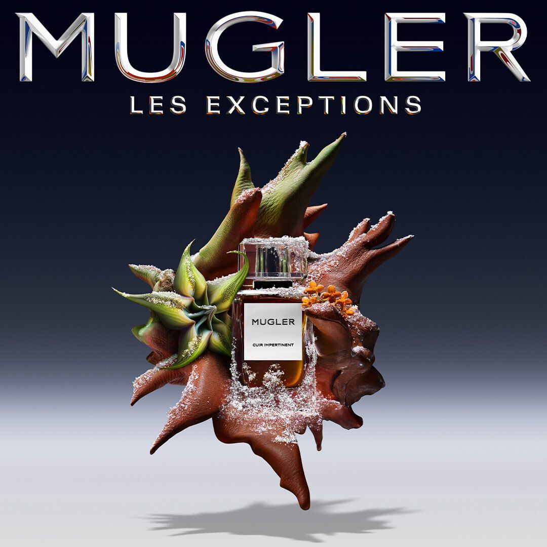 the cuir impertinent bottle, a testament to mugler's hybrid aesthetic, balances soft glass and sleek metal in a subtly faceted design. a bold clasp embraces the bottle, crowned by a majestic cap, echoing the architectural elegance of mugler creations. the minimalist label highlights the captivating color of the fragrance within, while the coffret contrasts iconic mugler blue against a luxurious black backdrop.
