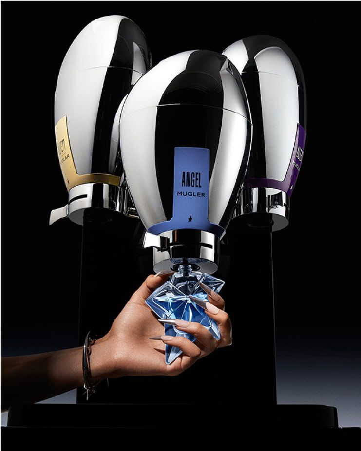 inspired by the fragrance fountains of the 18th-century, mugler’s fountain was born in 1992. First in the industry, it granted the brand a name of sustainable luxury pioneers. the fountain allows mugler lovers to spend less and refill their cherished bottle, while indulging in an in store ritual that turns an eco-responsible action into a moment of pleasure.
